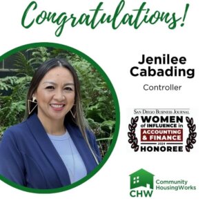 Congratulations to Jenilee Cabading, Controller for Community HousingWorks! She has been named to the San Diego Business Journal's 2024 Women of Influence in Accounting & Finance Honorees list. We appreciate Jenilee's leadership, hard work, and dedication to the CHW mission and congratulate her on this well-deserved recognition.