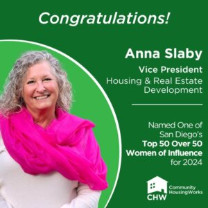 Congratulations to Anna Slaby, VP, Housing and Real Estate Development for Community HousingWorks! She has been named an honoree for the 2024 Top 50 Over 50 Women of Influence list by the San Diego Business Journal. Our team at CHW is grateful for her experience and leadership in helping create new affordable communities.